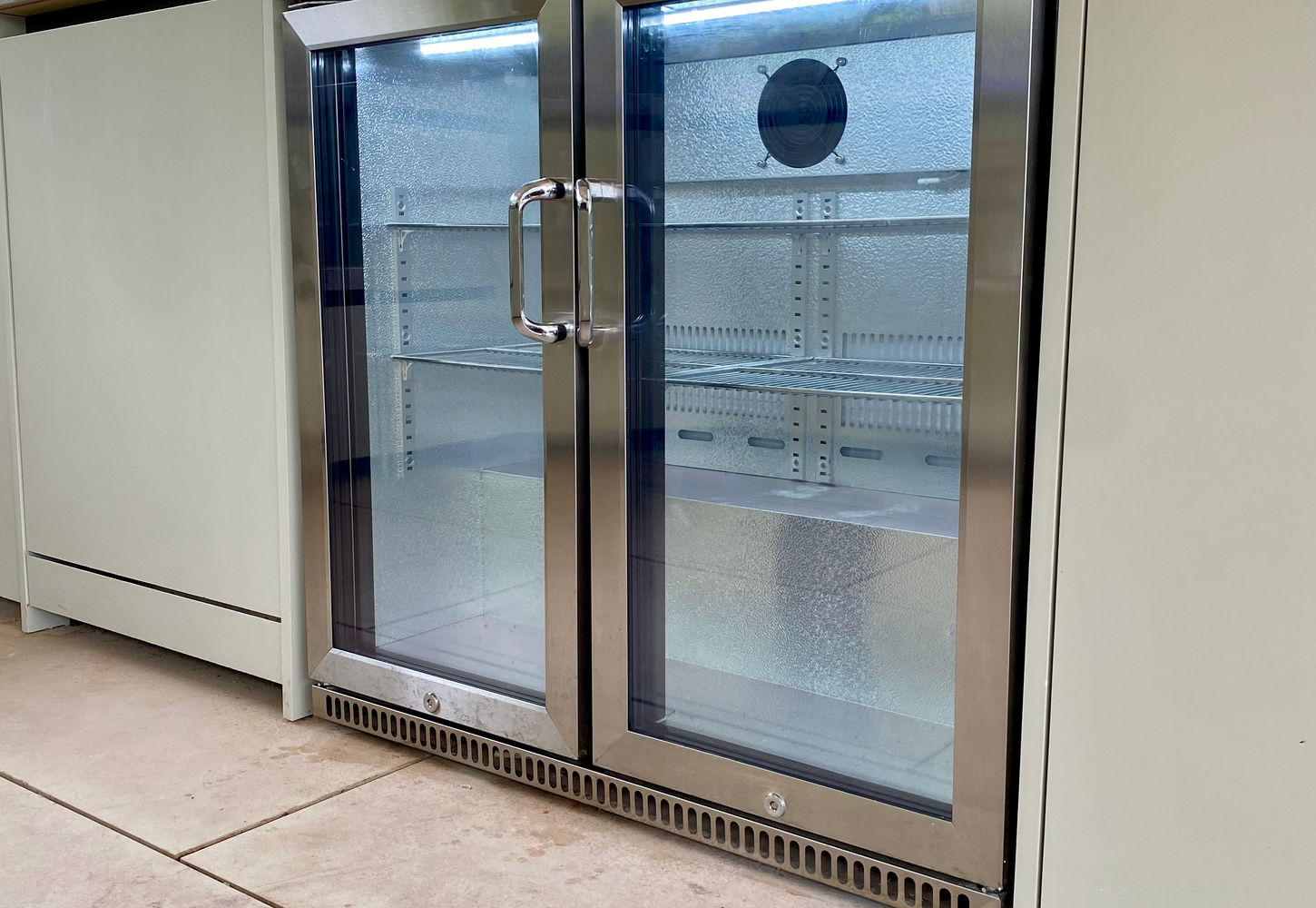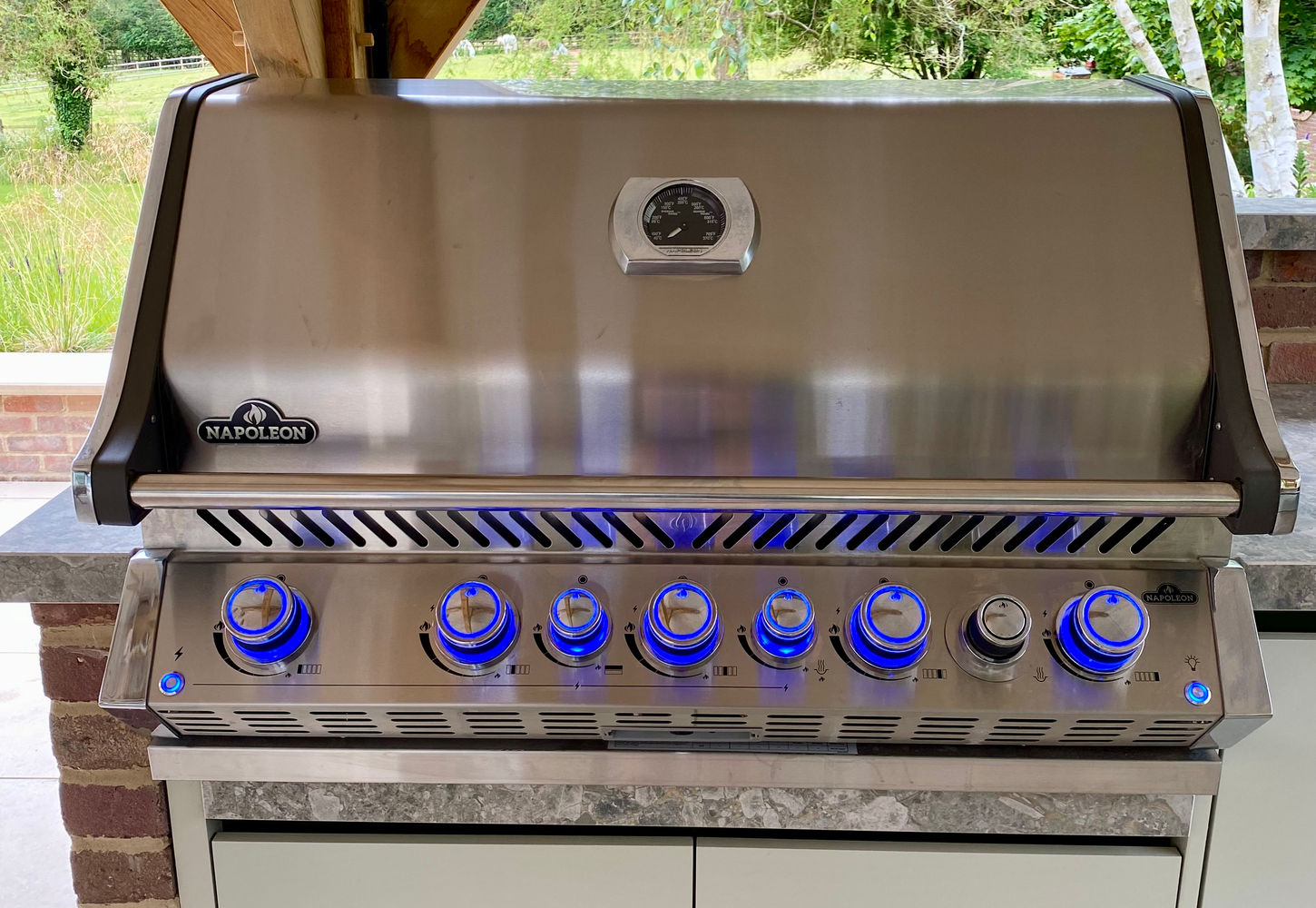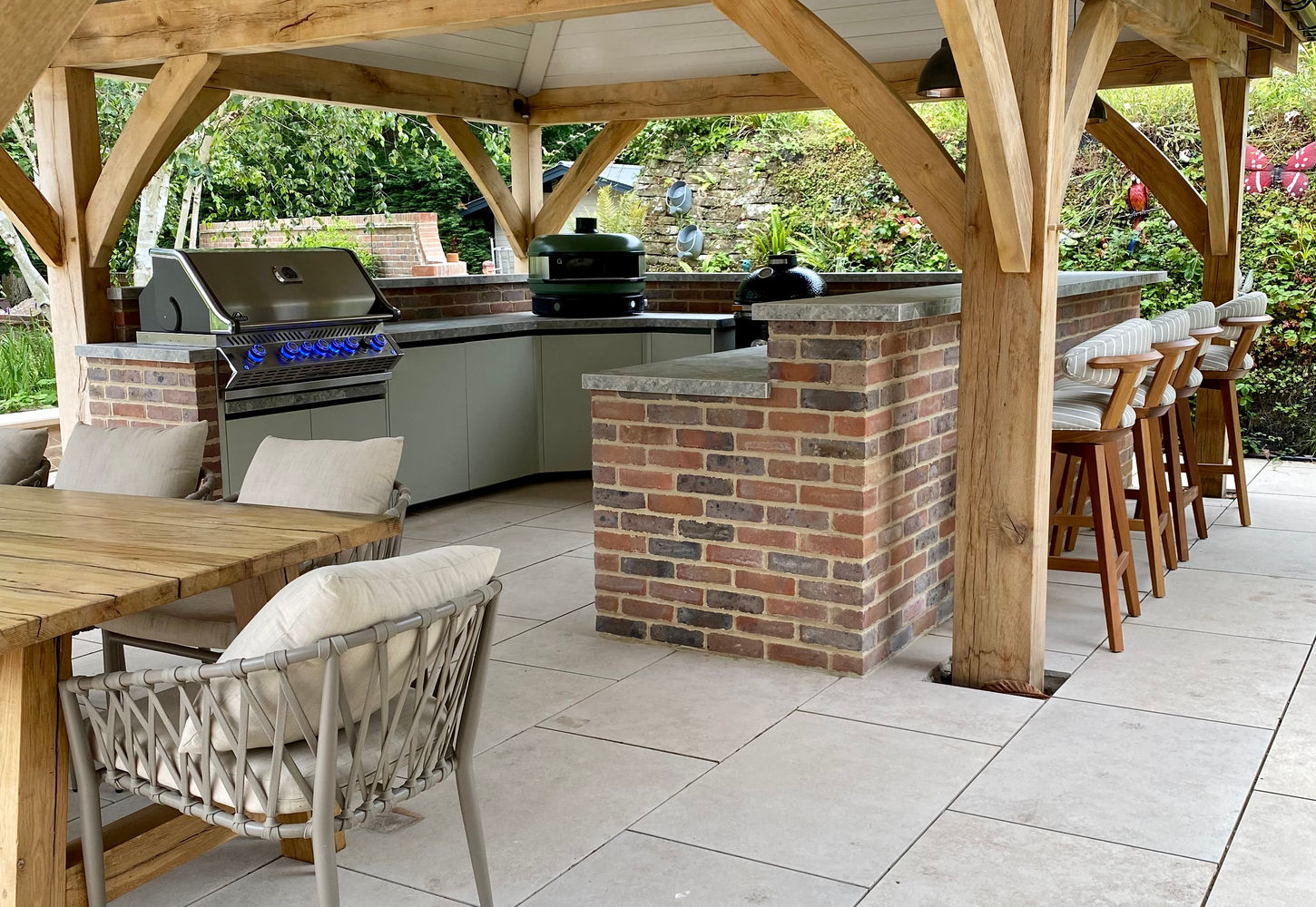 Our clients in the New Forest wanted a stylish outdoor living space to host family and friends, and this outdoor kitchen delivers! This garden kitchen combines a traditional brick exterior with modern AOS range cabinetry and Dekton Ceppo worktops, creating an outdoor kitchen design that has timeless charm. With three outdoor cooking appliances, plenty of prep space, an outdoor dining area and a raised bar area, this BBQ kitchen is ready for any occasion.