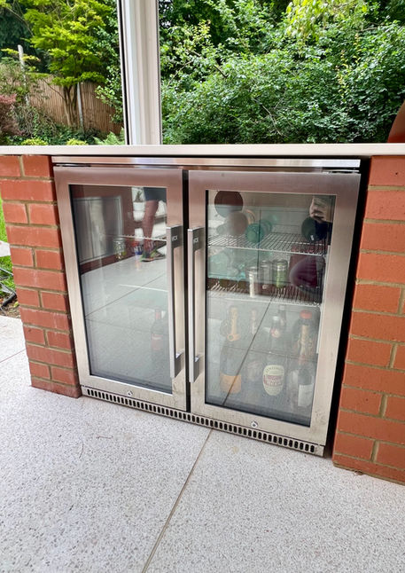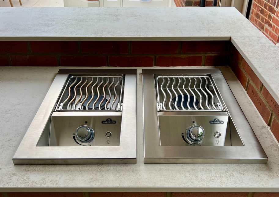 This brick-built outdoor kitchen is designed for year-round outdoor living, with a layout split into three practical zones beneath a spacious covered Nova Titan pergola. The setup provides shelter and shade in all seasons, making it ideal for cooking and entertaining in any weather. Appliances include a Beefeater 1600 Series 4 Burner BBQ, Alfa pizza oven, Napoleon side burners, Blackstone griddle, and an HCK double fridge—covering everything from quick weeknight meals to large garden gatherings. Durable Dekton worktops keep maintenance low, while stainless steel storage units add practicality and a smart finish. A ceramic sink and tap make food prep and cleaning straightforward, ensuring the space is as functional as it is versatile. Designed with both cooking and hosting in mind, this kitchen brings together all the essentials for a complete outdoor entertaining experience.