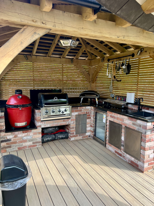 Brick Outdoor Kitchen with Oak Gazebo Shelter