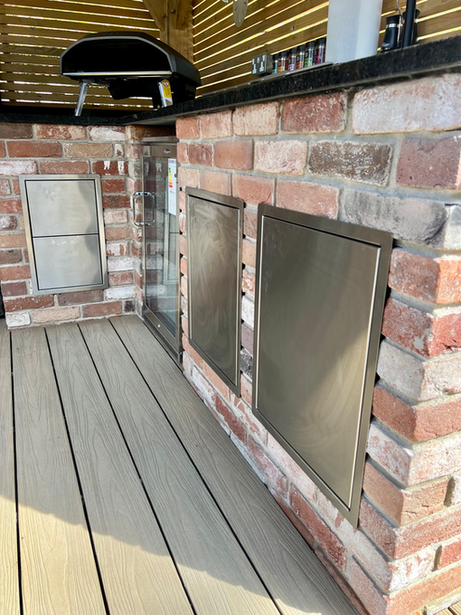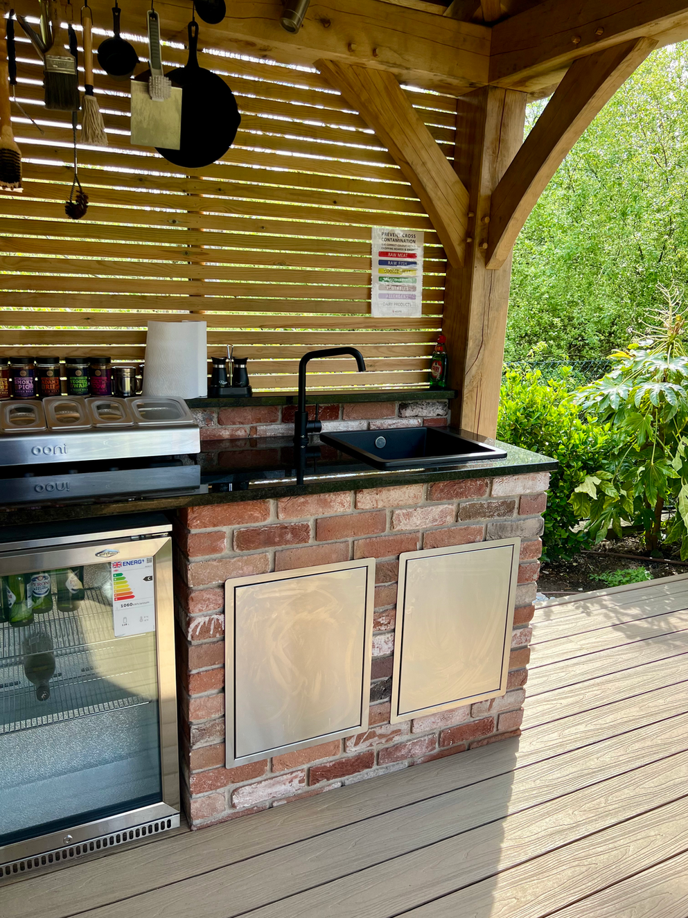 This previously unused corner of the garden has been completely transformed into a brilliant outdoor cooking and seating space. The L-shaped outdoor kitchen is built from brick and sits under a solid oak gazebo, fitted with lighting and heaters so it can be used comfortably all year round.