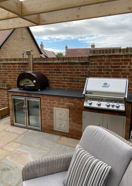 This straight-line brick outdoor kitchen blends effortlessly into the outdoor living space, matching the brick walls around it. On one end, there's an Alfa pizza oven - great for quick, wood-fired pizzas - while the other side of the BBQ area features a Napoleon built-in gas BBQ for classic grilling. Below them there's a double fridge and some handy storage space. A seating area next to the garden kitchen sits under an open pergola, making it a comfortable spot for outdoor cooking and socialising outdoors.