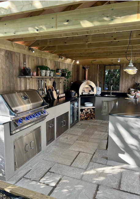 The stone grey render finish pairs perfectly with the surrounding grey patio tiles, while offering a striking contrast to the timber shelter above. Two outdoor cooking appliances - a Napoleon gas BBQ and an Alfa pizza oven - make this outdoor cooking space perfect for hosting, with a double fridge nearby for drinks and chilled ingredients. With outdoor hanging lights, decorative touches, and a practical layout, this outdoor kitchen and bar setup creates an inviting space for entertaining in the stunning garden setting of this historic property.