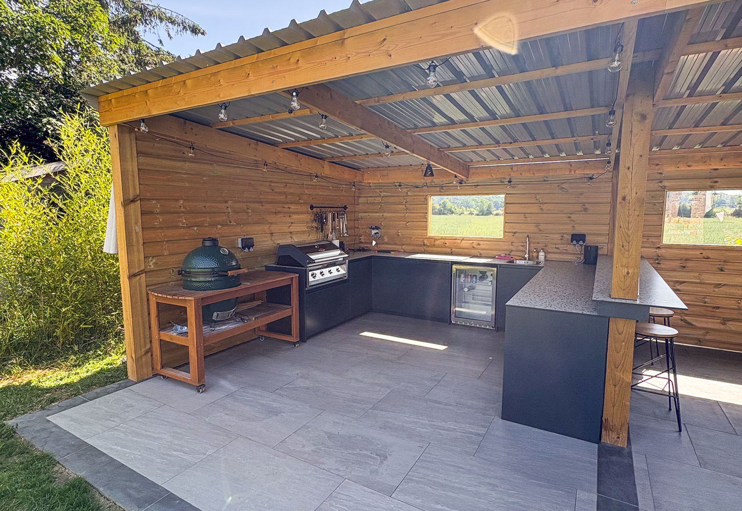 This outdoor kitchen is part of a fully equipped entertaining space, designed to make outdoor living easy all year round. Built using our AOS range units, it features a Beefeater 1600 gas BBQ and a Big Green Egg Kamado oven—giving you everything from quick grilling to low-and-slow cooking options. The compact laminate worktops offer plenty of prep space and a clean, modern finish that complements the surrounding materials. A floating bar area adds versatility, ideal for serving drinks or tidying up without stepping away from the social space. With a built-in HCK single fridge, stainless steel sink and tap, triple drawer unit, and pullout bin, the layout is designed to keep everything organised and close at hand. Set within a large shelter that also includes a seating area and hot tub, this outdoor kitchen forms part of a space that’s made for hosting. Whether it’s a casual evening or a big get-together, it’s all set up for cooking, relaxing, and entertaining in comfort.