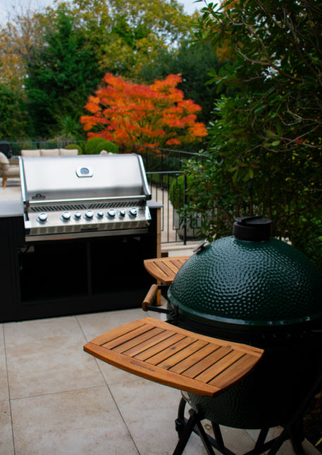 This L-shaped outdoor kitchen is designed for cooking, entertaining, and relaxing, set within a natural garden setting that gives the space a calm, grounded feel. Built using Nolita modular kitchen units, the layout is finished with a distinctive scaffold board outer wall, combining clean modern lines with rustic character. Cooking appliances include a Gozney Dome pizza oven for restaurant-quality pizzas and a Napoleon Prestige Pro 665 BBQ for everyday grilling. An outdoor fridge keeps drinks and ingredients close at hand, while a built-in bar area creates a natural spot for serving and socialising. Generous integrated storage keeps the kitchen organised and practical for regular use. Designed to blend seamlessly with its surroundings, this outdoor kitchen offers a versatile setup for summer barbecues, relaxed evenings, and laid-back weekends outdoors, showing how thoughtful design can transform a garden space.