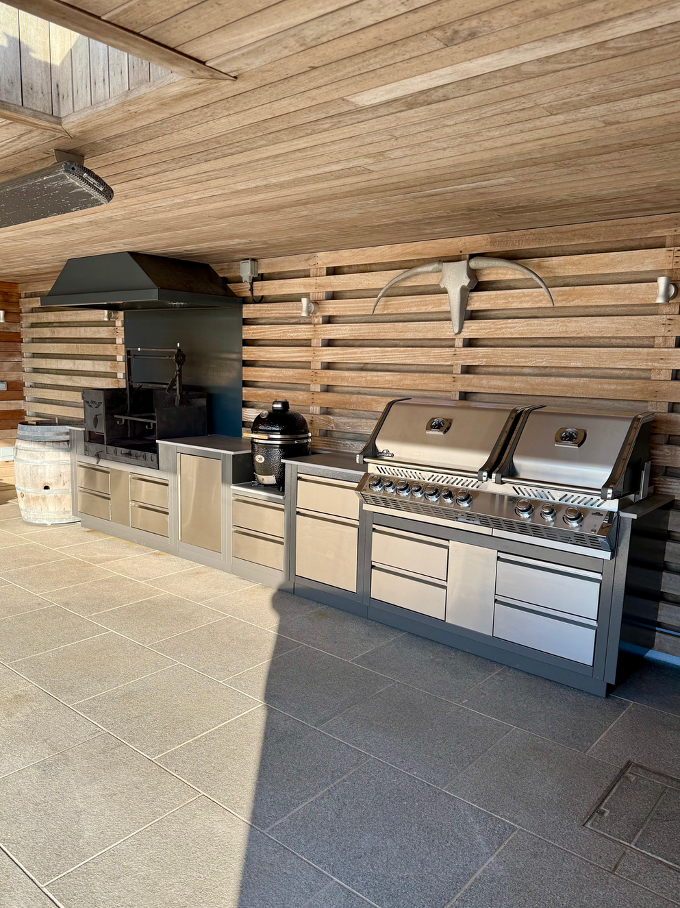 We travelled to Jersey in the Channel Islands to build this modular Napoleon Oasis outdoor kitchen, which was fully assembled in just one day. It features four outdoor cooking appliances - a gas grill, kamado charcoal BBQ, Argentinian grill, and a barrel smoker - giving the client plenty of flexibility, whether they’re grilling, smoking, or slow-cooking. There’s tons of storage built in, keeping everything organised and accessible. With a full shelter overhead, the kitchen is ready to be used all year, whatever the weather.