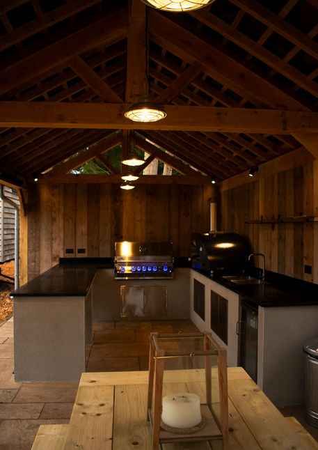 This bespoke outdoor kitchen sits beneath a beautifully crafted oak shelter, designed to feel completely at home within its forested surroundings. Forming part of a wider estate renovation, the U-shaped rendered kitchen layout maximises space and flow, creating a practical setup for outdoor cooking, dining, and entertaining. At the heart of the kitchen is a Napoleon Prestige Pro BBQ alongside an Alfa pizza oven, supported by a built-in bar, sink and tap, and outdoor fridge—providing everything needed for relaxed hosting. An extended seating area with a solid oak table completes the space, adding warmth and character that balances with the clean lines of the kitchen. Surrounded by woodland and sheltered for year-round use, this outdoor kitchen is equally suited to summer gatherings and cosy winter evenings, offering a considered blend of luxury, rustic charm, and contemporary outdoor design.
