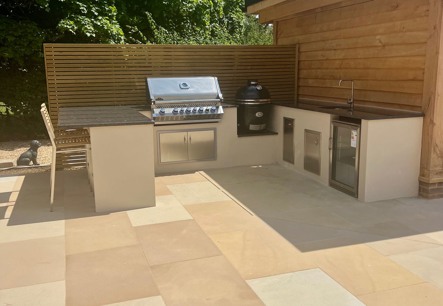 This U-shaped outdoor kitchen and bar is designed for outdoor cooking and hosting. It includes a 7-burner BBQ, Kamado oven, fridge, sink, and plenty of storage. There’s space for barstools, making it a great outdoor entertainment area for hosting guests. The 30mm dark polished granite worktops, stainless steel cupboard doors, and sand and cement render complement the patio tiles, creating a perfect addition to the garden.